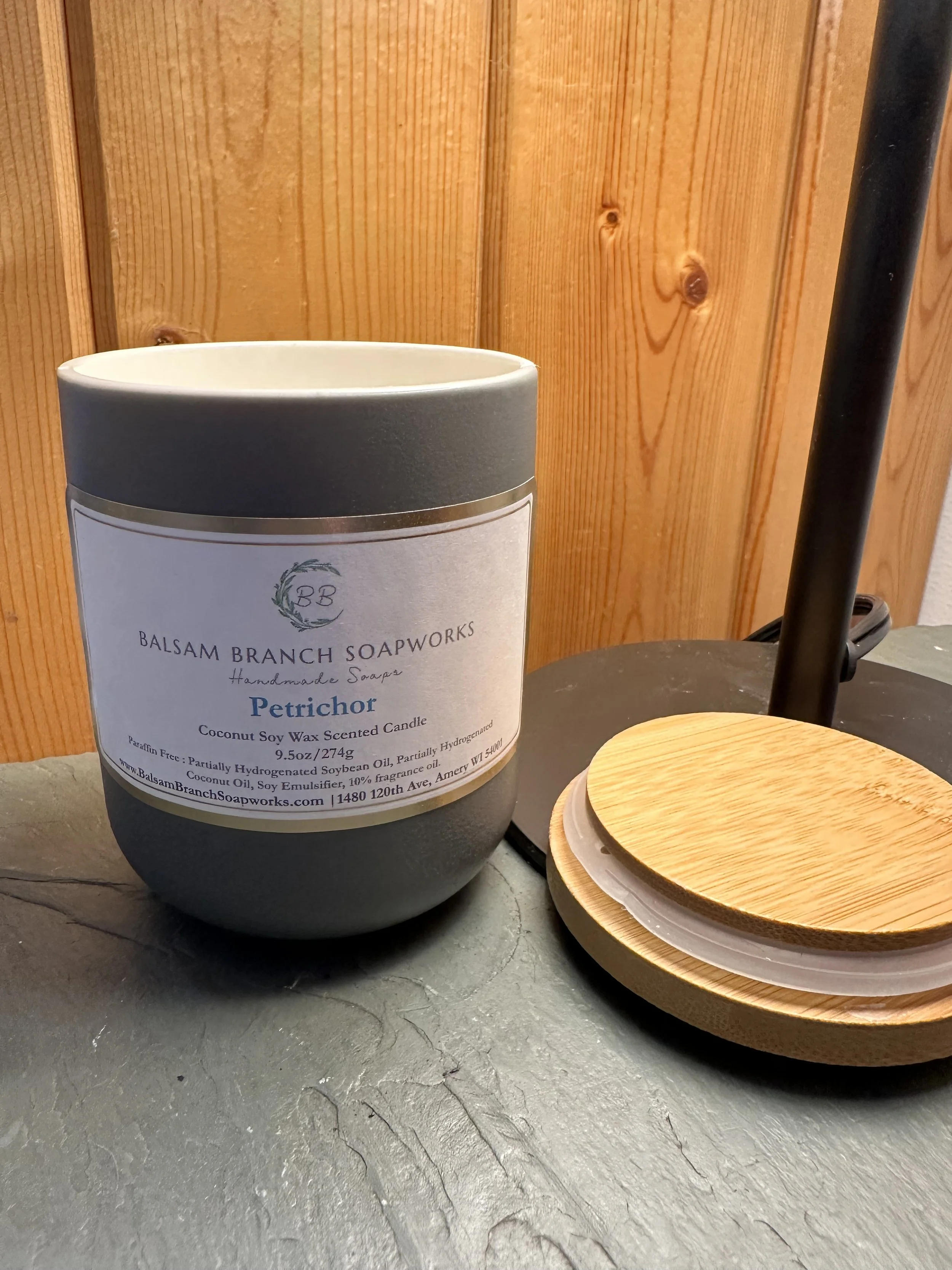 Paraffin Free Candle with Coconut Soy Wax and Fragrance oil that has the fresh scent of after it rains.