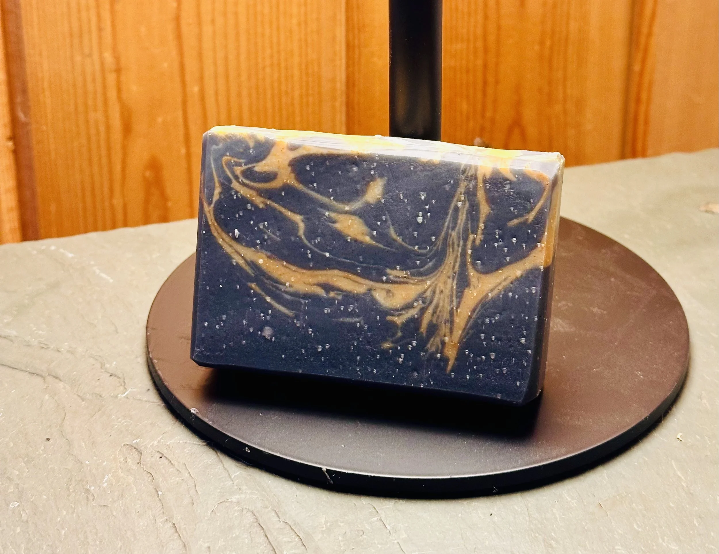This Cold Processed Soap Bar is part of the Back Woods Line and includes Activated Charcoal, Vitamin E, and Saponified Oils including Shea Oil.